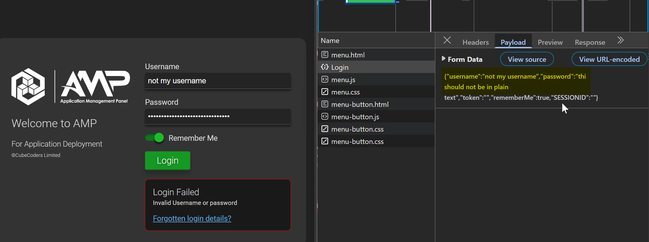 - On the ‘payload’ tab you will see the username and password used to login in plain text.