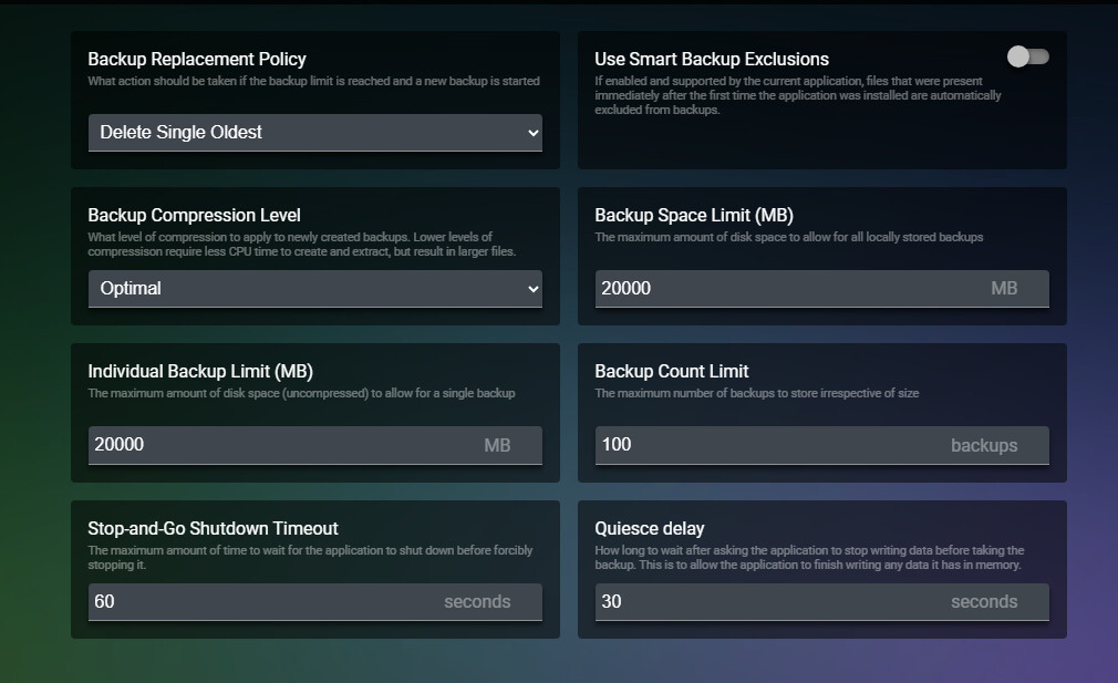Hi, Im currently having some issues creating backups for my minecraft server. I have a task setup to run every night and that was working for a while. But then I noticed it was not creating anymore. I figured out that was because the default size limits and backup amounts were set. So I removed those variables (just left the boxes blank guessing it removed any restrictions) and that worked for a night. But now its happening again. I tried also setting max numbers in those fields thinking it didnt like having no values set but no luck still. When I run a manual back it starts the task, says “Creating Backup