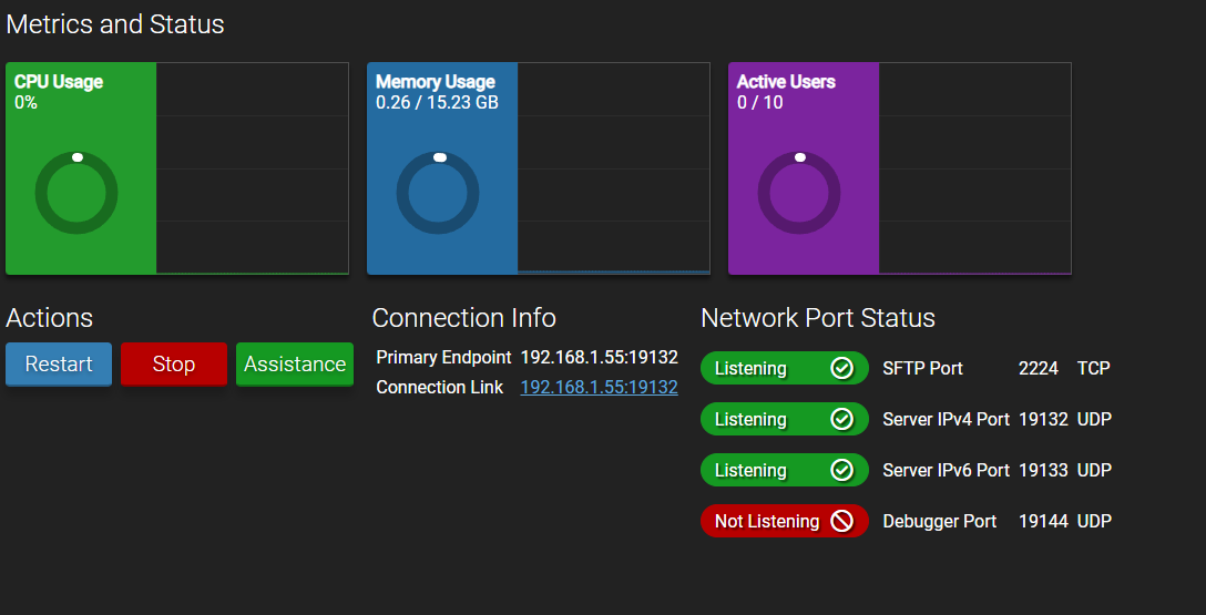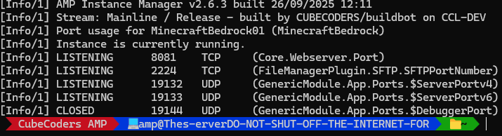 So, I was setting this up and tried to get my friends on the server, but it didn’t work. Then, I tried to figure out what was going on. What I do is go to my router settings and fill in every port. But then, when is use the [ampinstmgr ports MinecraftBedrock01] on the Linux panel, it says the ports are closed, so I removed the ports from the Wi-Fi setting, and now it says listening except the Debugger port