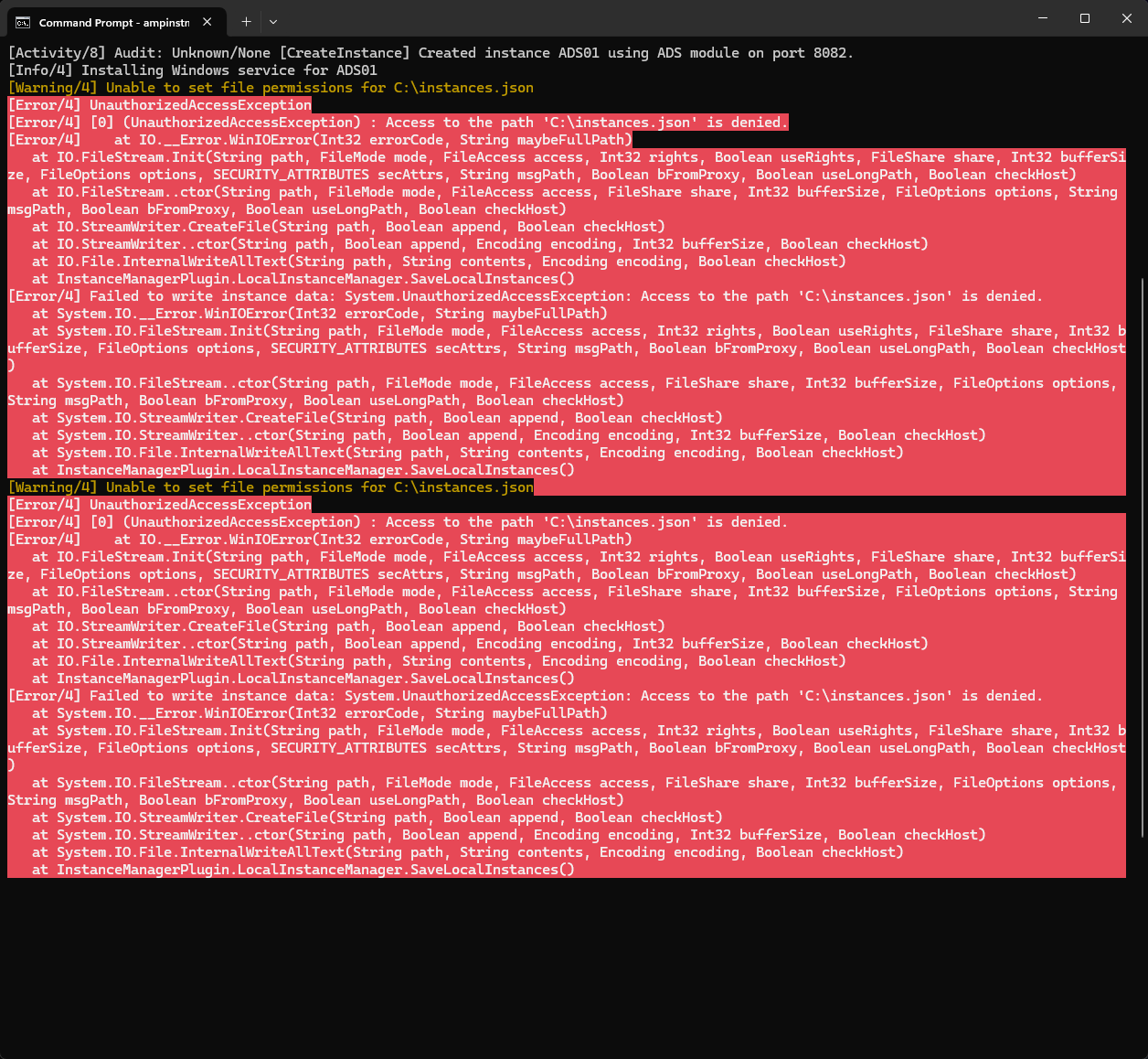 I forgot to mention that I did reinstall AMP and reboot my pc with everything I needed backed up numerous times. I imported my servers after an installation finally worked (since every installation before had something going wrong) and tried to reboot AMP. Now when I resort to my troubleshooting methods which I listed in the original post, AMP Instance Manager opens with the installer prompt every time regardless of setting up AMP Login Details and the command prompt provides an error when I do ampinstmgr quickstart.