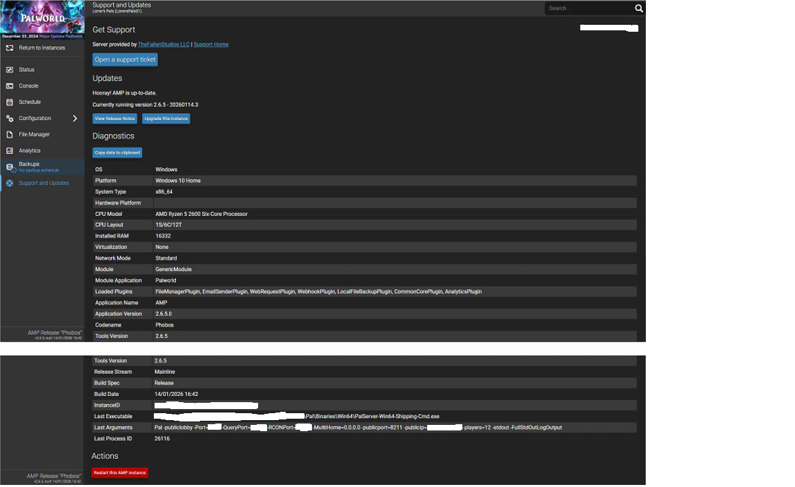 Update occurred overnight, this server starts and crashes immediately. A different palworld server instance will start and run without crashing (it has not yet been updated). I have run fully through the AMP update process ( How to update AMP to the latest version ), rebooted the computer a few times, no obvious source of trouble.